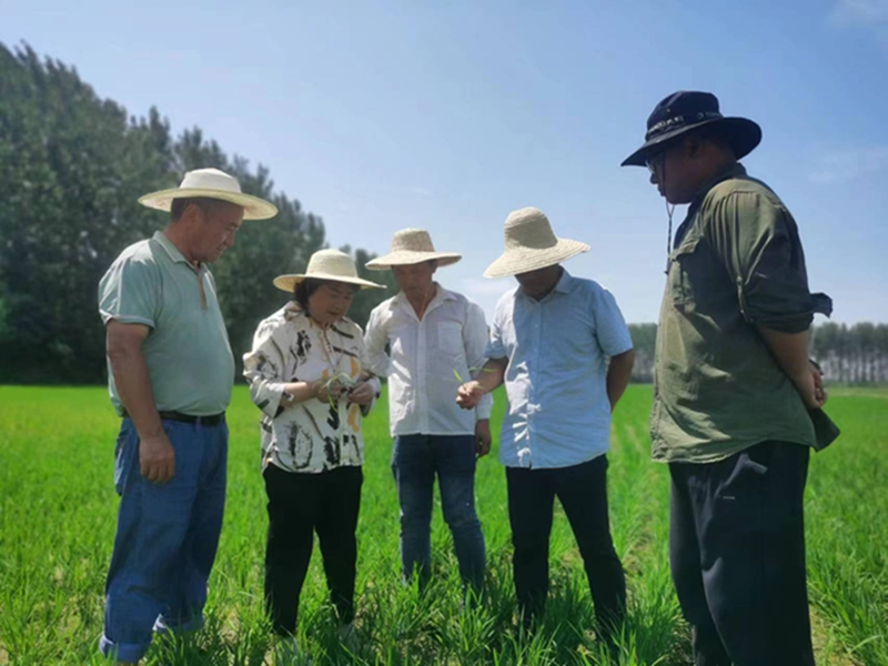 2023年7月19日,王玉叶(左二)指导水稻分蘖期田间管理。